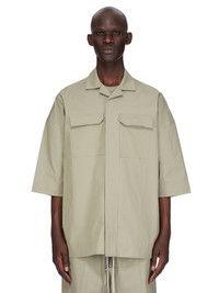 RICK OWENS SS25 HOLLYWOOD MAGNUM TOMMY SHIRT IN CELADON HEAVY COTTON POPLIN THIS MAGNUM TOMMY SHIRT IS BELOW HIP LENGTH WITH AN OVERSIZE FIT, AND ELBOW LENGTH SLEEVES WITH A DROPPED ARMHOLE. IT HAS A CENTRE FRONT OPENING, AND A CLASSIC FLAT COLLAR. IT HAS A HEMLINE WITH BEVELED SIDE SPLITS AND TWO CHEST POCKETS WITH BEVELED FLAPS AND TOPSTITCHING THIS MEDIUMWEIGHT COTTON POPLIN HAS A CRISP HANDFEEL AND WASHED FINISH THIS FABRIC IS MADE USING GOTS CERTIFIED ORGANIC COTTON WHICH MEANS THE NATURAL FIBER IS GROWN WITHOUT HARMFUL CHEMICALS, LEAVING OUR SOIL, AIR AND WATER CLEANER FROM CONTAMINATES COLOR: CELADON MATERIAL: 97% COTTON + 3% ELASTANE MODEL IS 189CM TALL MODEL WEARS SIZE 48