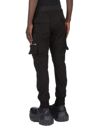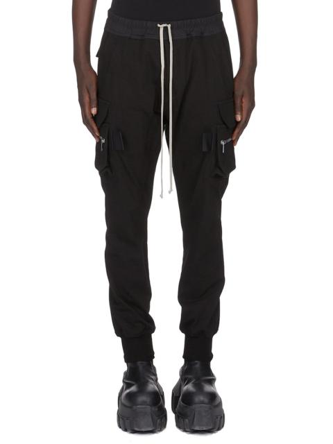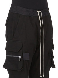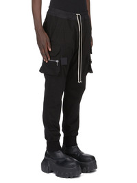 RICK OWENS FW25 CONCORDIANS MASTODON MEGACARGO IN BLACK HEAVY JERSEY THESE MASTODON MEGACARGO PANTS ARE FULL LENGTH WITH A SLIM FIT AND AN ELASTICIZED WAIST WITH DRAWSTRING AND ELASTICATED ANKLES. THEY FEATURE TWO SQUARE CARGO POCKETS ON THE THIGH, WITH TWO BEVELED CARGO POCKETS BELOW, AND TWO SQUARE BACK POCKETS, ALL HAVE FLAPS WITH HOOK AND LOOP FASTENINGS AND TOPSTITCHING THIS HEAVYWEIGHT JERSEY IS COMPACT WITH A DRY HANDFEEL THIS JERSEY IS MADE USING GOTS CERTIFIED ORGANIC COTTON WHICH MEANS THE NATURAL FIBER IS GROWN WITHOUT HARMFUL CHEMICALS, LEAVING OUR SOIL, AIR AND WATER CLEANER FROM CONTAMINATES COLOR: BLACK MATERIAL: 97% COTTON + 3% ELASTANE BUTTONS 100% BUFFALO HORN MODEL IS 189CM TALL MODEL WEARS SIZE 48