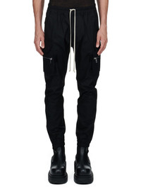 RICK OWENS SS25 HOLLYWOOD MASTODON CARGO IN BLACK HEAVY COTTON POPLIN THESE MASTODON CARGO PANTS ARE FULL LENGTH WITH A SLIM FIT AND AN ELASTICIZED WAISTBAND WITH DRAWSTRING. THEY FEATURE TWO SIDE POCKETS, PLUS TWO ZIPPERED CARGO PANNIER POCKETS WITH FLAPS AND TABS ON THE OUTER THIGH. THEY HAVE TWO BACK POCKETS WITH FLAPS AND ELASTICATED ANKLES THIS MEDIUMWEIGHT COTTON POPLIN HAS A CRISP HANDFEEL AND WASHED FINISH THIS FABRIC IS MADE USING GOTS CERTIFIED ORGANIC COTTON WHICH MEANS THE NATURAL FIBER IS GROWN WITHOUT HARMFUL CHEMICALS, LEAVING OUR SOIL, AIR AND WATER CLEANER FROM CONTAMINATES COLOR: BLACK MATERIAL: 97% COTTON + 3% ELASTANE MODEL IS 189CM TALL MODEL WEARS SIZE 48