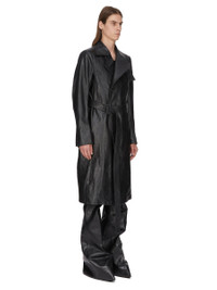 RICK OWENS SS26 TEMPLE MASTODON TRENCH IN BLACK GLASGOW CALF LEATHER THIS MASTODON TRENCH IS KNEE LENGTH WITH LONG SLEEVES, BUTTONED CUFFS AND A WIDE LAPEL WITH A BUTTONED ISLAND NECK FLAP. IT HAS A VERTICAL POCKET ON THE LEFT CHEST, FOUR BUTTON CONCEALED FRONT CLOSURE, A BELT AND BELT LOOPS AND BUCKLE, AND A BACK SLIT. IT IS FULLY LINED AND HAS INTERNAL ZIPPERED POCKETS. THIS MEDIUMWEIGHT CALF LEATHER IS VEG TANNED AND FINISHED USING NATURAL WAXES. IT HAS A CRISPY HANDFEEL AND MATTE SURFACE. VEG TANNING MEANS ONLY VEGETAL AND NATURAL TANNINS WERE USED IN THE PROCESS OF TANNING AND PRESERVING THIS LEATHER. THIS LEATHER IS MADE BY A THIRD GENERATION FAMILY OWNED TANNERY IN THE SOUTH OF ITALY. COLOR: BLACK MATERIAL:100% CALF LEATHER BODY AND POCKETS LINING 100% COTTON SLEEVES LINING 100% CUPRO BUTTONS AND BUCKLE 100% BUFFALO HORN MODEL IS 189CM TALL MODEL WEARS SIZE 48