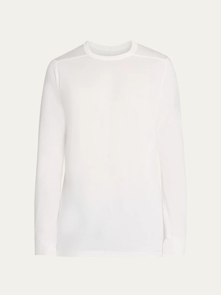 Rick Owens T-shirt crafted from lightweight cotton with a modern saddle shoulder Crew neckline Long sleeves Ribbed cuffs Center back seam Pullover style Classic fit Cotton Hand wash Made in Italy Online Inquiries: BGS21_NDQJ5| Store Inquiries: #5067145