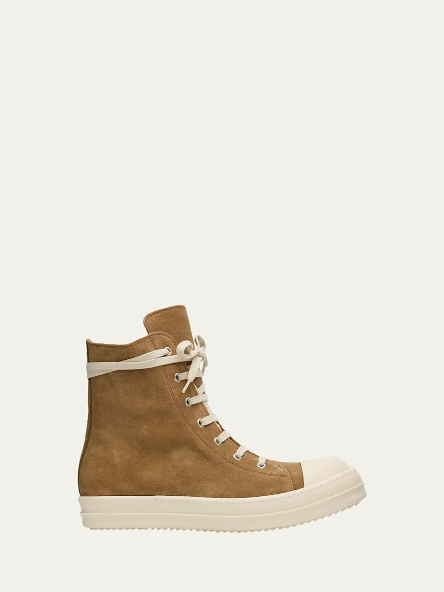 Crafted from suede, the "Sneaks" sneaker by Rick Owens features a sleek, hightop silhouette. Flat heel Round cap toe Laceup vamp Side zip eases dress Toothed TPR outsole Lining: Leather Made in Italy