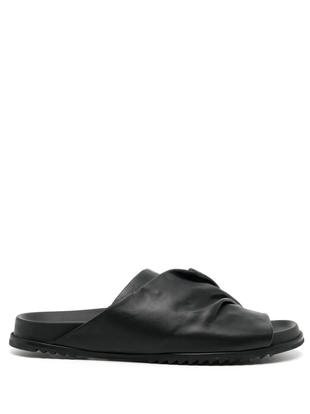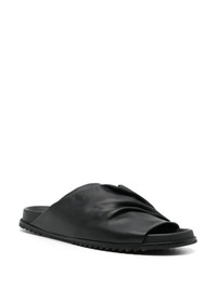 Morbius Granola leather sliders Highlights - Jet black - Calf leather - Smooth grain - Draped detailing - Round open toe - Slip-on style - Branded leather insole - Moulded footbed - Flat rubber sole Made in Italy Composition Sole: Rubber 100%, Calf Leather 50% Lining: Calf Leather 100% Outer: Lamb Nubuck Leather 100% SIZE & FIT Measurement HEEL 1.18 in(3 cm) Sole height 0.78 in(2 cm)