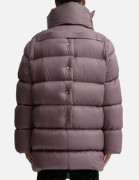 - Rick Owens - Mountain Jacket - Made using GRS certified recycled nylon - Mid-thigh length - Long sleeves - Heavyweight duvet quilted with horizontal stitching lines - Centre front zipper - Two side welt pockets with snaps - Centre back seam opening with snap closures - High funnel-neck collar with three snap closures that can be worn wrapped around or hanging open - Signature cotton webbing strap with rivet detail on the back yoke - Two internal zippered pockets - Color: Amethyst - Material: 100% Nylon; Padding : 90% Goose Down, 10% Mallard Feathers - See more Jackets and Clothing SIZING - Model wears size 48 - Model measures: Height 187cm, Chest 36”/91cm, Waist 29”/74cm, Hip 37”/94cm