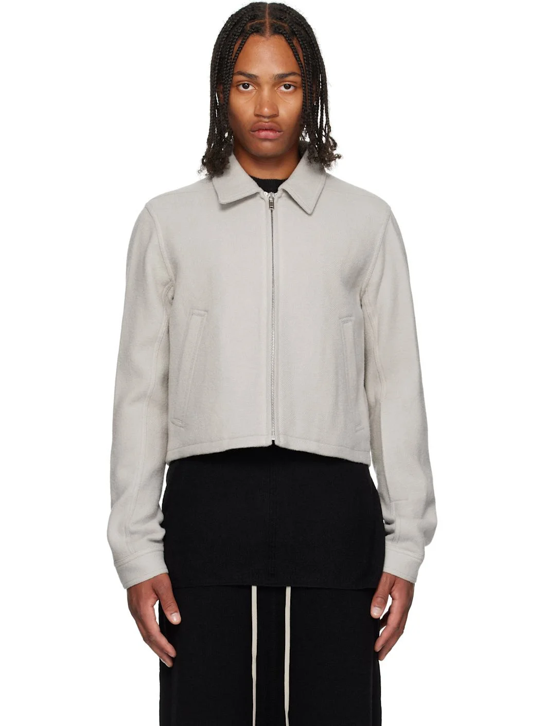 Boiled virgin wool drill jacket. · RWS-certified virgin wool · Spread collar · Zip closure · Welt pockets at waist · Dropped shoulders · Press-stud tab at cuffs · Webbing strap at back yoke · Zip pockets at interior · Full cotton twill and cupro satin lining Supplier color: Pearl Body: 100% virgin wool. Lining 1: 100% cotton. Lining 2: 100% cupro. Made in Italy 252232M180007