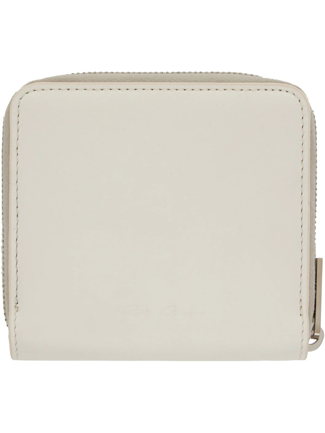 Grained lambskin wallet. · Logo embossed at face · Zip closure · Six card slots at interior · Buffed lambskin lining · Brushed silver-tone hardware · H3.75" x W4" x D0.5" Supplier color: Milk Lambskin. Made in Italy 252232M164013