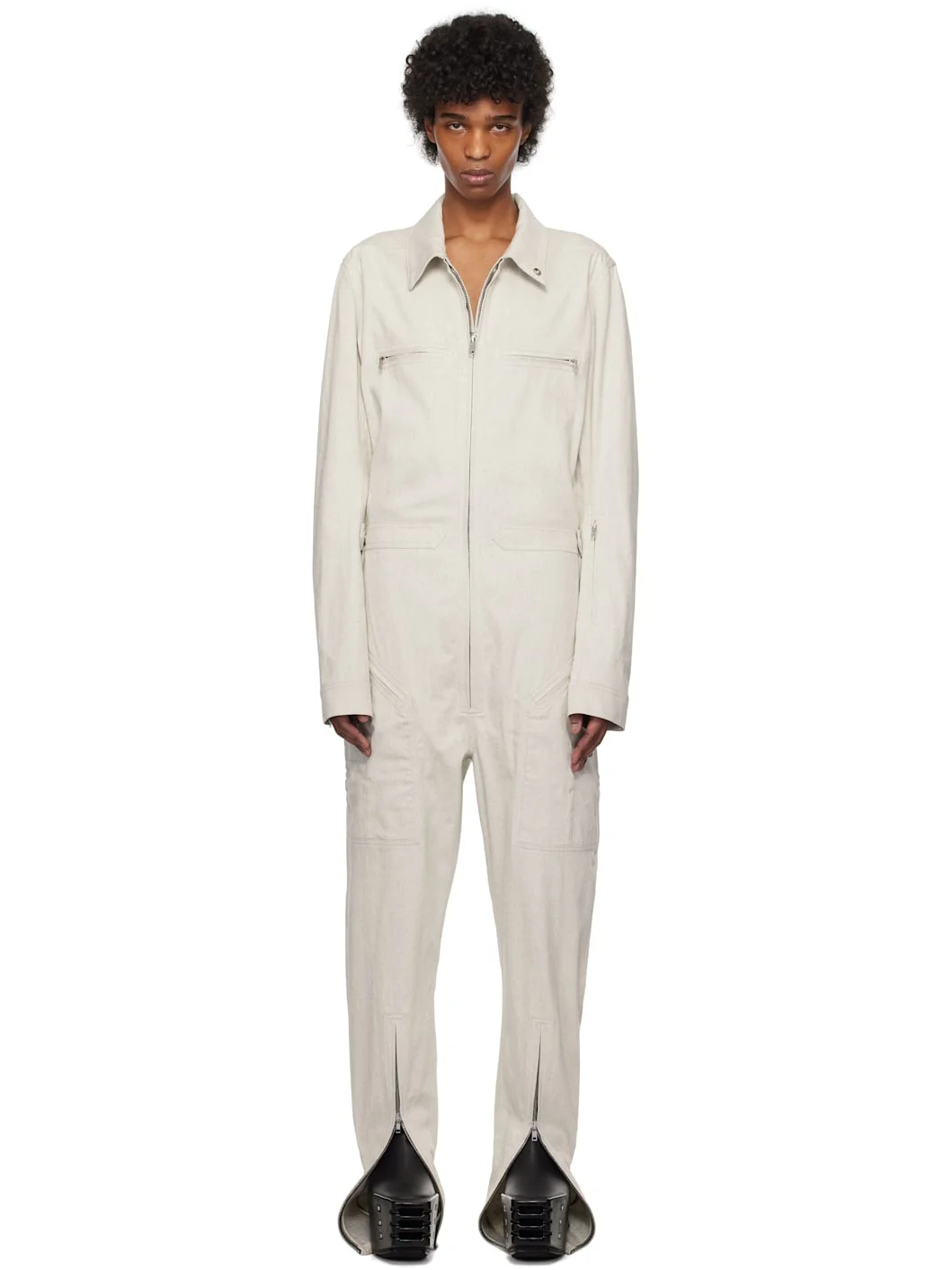 Non-stretch denim jumpsuit. · Press-stud at spread collar · Zip closure · Zip pockets at chest · Four-pocket styling · Zip vent at cuffs · Adjustable press-stud tab at outseams · Saddle shoulders · Press-stud barrel cuffs Supplier color: Dinge Body: 100% cotton. Lining: 100% cotton. Made in Italy 251232M191050