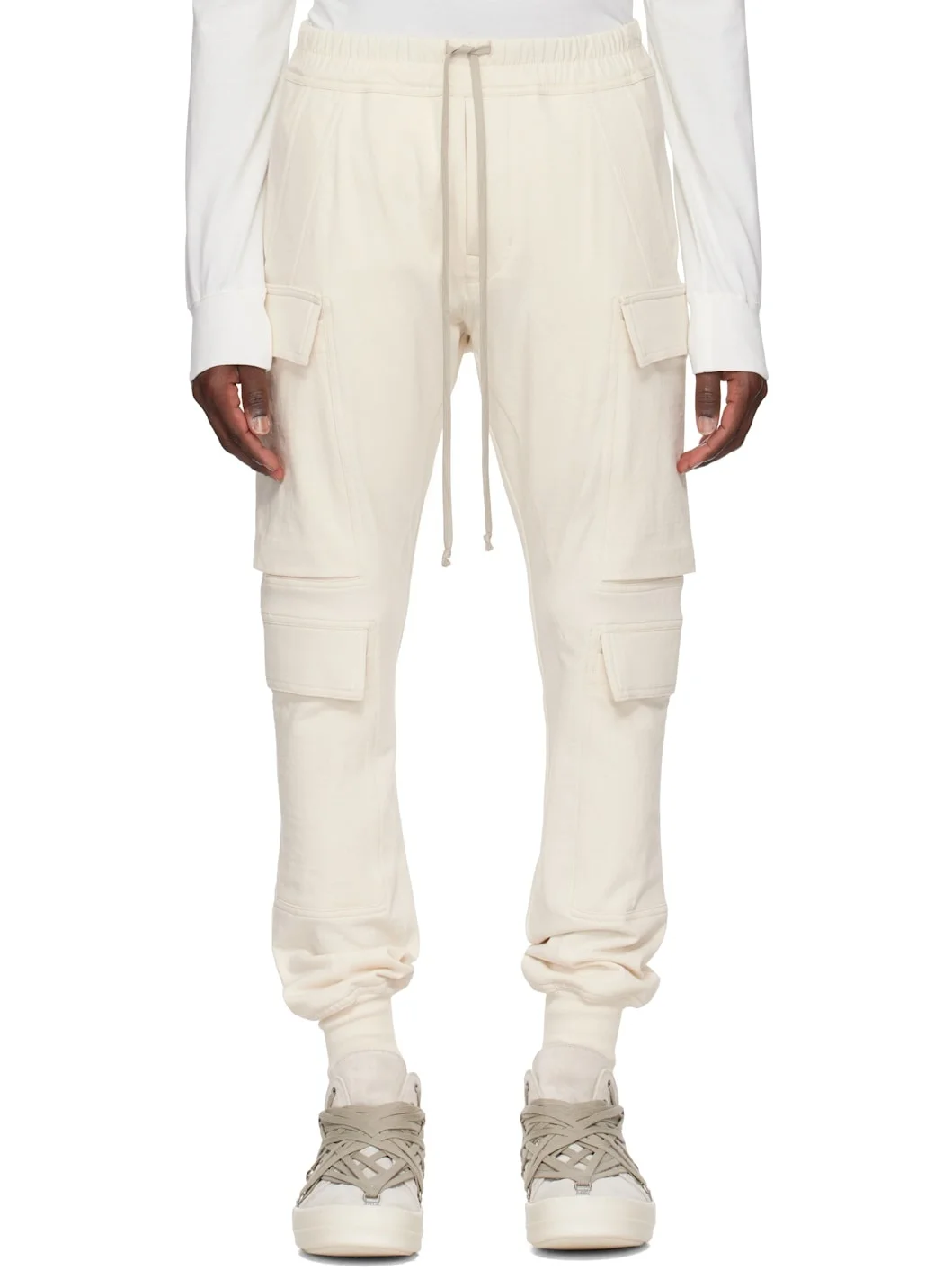 GOTS-certified organic cotton jersey cargo pants. · Drawstring at elasticized waistband · Four-pocket styling · Button fly · Rib-knit cuffs · Cargo pockets at outseams · Horn hardware Supplier color: Natural Body: 100% cotton. Body 2: 97% cotton, 3% elastane. Made in Italy 251232M188023