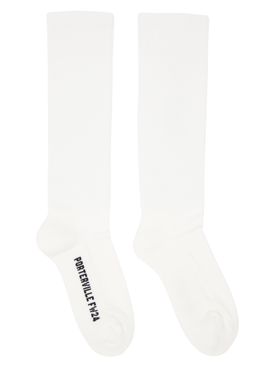 Pair of knee-high knit and rib-knit stretch cotton-blend socks in off-white. Jacquard text at soles. Supplier color: Milk/Black