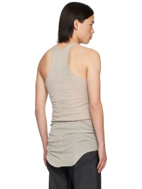 Semi-sheer GOTS-certified organic cotton ribbed jersey tank top. · Scoop neck · Raw edge at curved hem · Racer back · Central seam at back Supplier color: Pearl