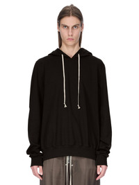 RICK OWENS FW25 CONCORDIANS HOODIE IN BLACK HEAVY JERSEY THIS HOODIE IS BELOW HIP LENGTH WITH LONG SLEEVES AND AN AMPLE FIT. IT HAS A BIG HOOD WITH A DRAWSTRING, RIBBED CUFFS AND WAISTBAND. IT FEATURES THE SIGNATURE LEVEL SHOULDER SEAMS. THIS HEAVYWEIGHT JERSEY IS COMPACT WITH A DRY HANDFEEL. THIS JERSEY IS MADE USING GOTS CERTIFIED ORGANIC COTTON WHICH MEANS THE NATURAL FIBER IS GROWN WITHOUT HARMFUL CHEMICALS, LEAVING OUR SOIL, AIR AND WATER CLEANER FROM CONTAMINATES. COLOR: BLACK MATERIAL: 100% COTTON MODEL IS 189CM TALL MODEL WEARS SIZE S