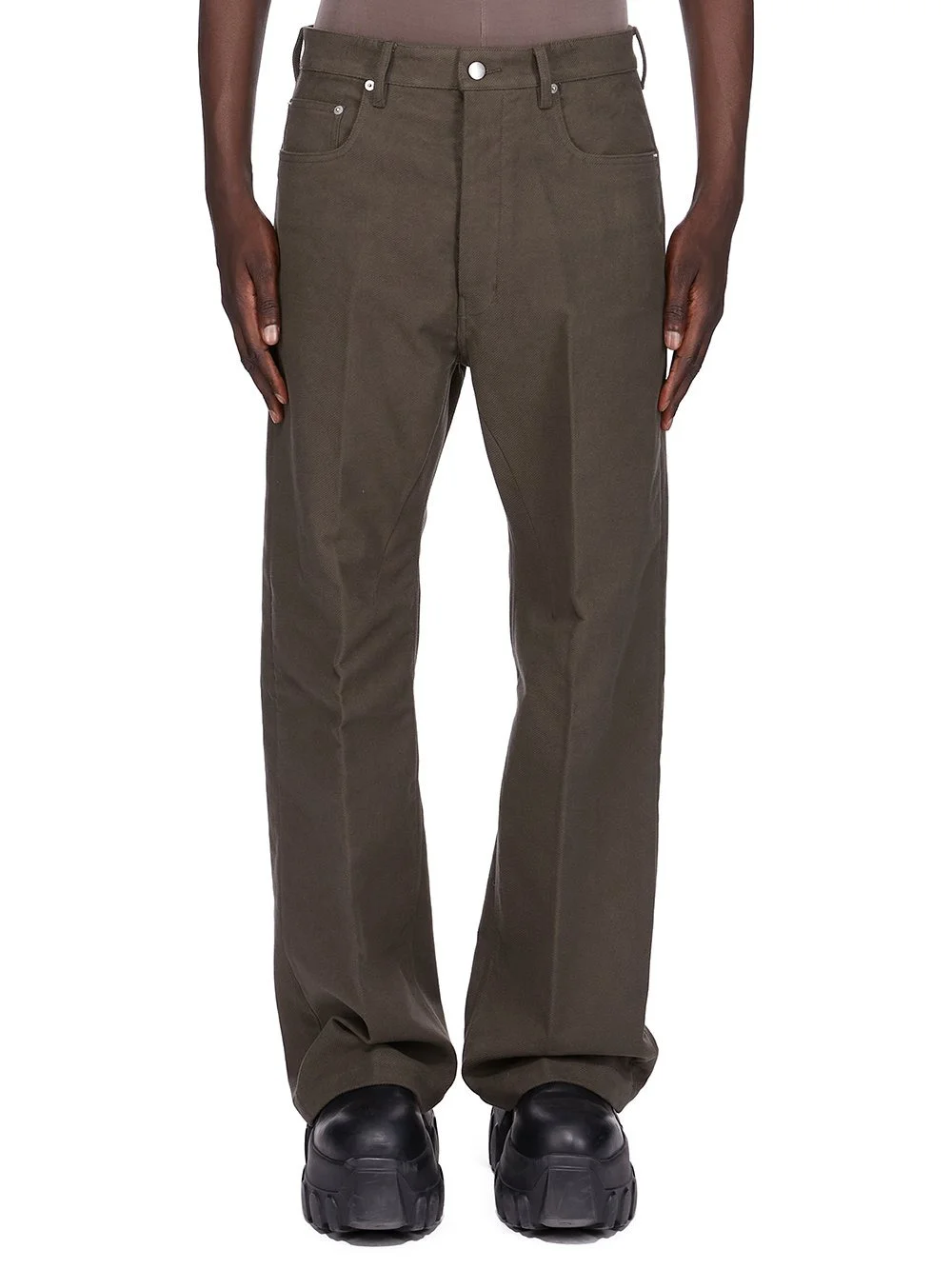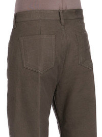 RICK OWENS FW25 CONCORDIANS GETH JEANS IN BOSCO BRUSHED HEAVY TWILL THESE GETH JEANS ARE A FULL LENGTH 5 POCKET JEAN WITH A LOW-RISE AND WIDE FIT. THEY HAVE A SILVER BUTTON FLY, BELT LOOPS AND POCKET RIVETS THIS MEDIUMWEIGHT COTTON TWILL FABRIC HAS A SOFT BRUSHED HANDFEEL THIS FABRIC IS MADE USING GOTS CERTIFIED ORGANIC COTTON WHICH MEANS THE NATURAL FIBER IS GROWN WITHOUT HARMFUL CHEMICALS, LEAVING OUR SOIL, AIR AND WATER CLEANER FROM CONTAMINATES COLOR: BOSCO MATERIAL: 100% COTTON MODEL IS 189CM TALL MODEL WEARS SIZE 31