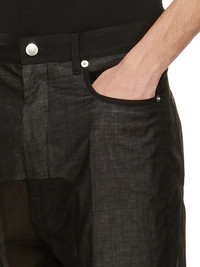 RICK OWENS SS25 HOLLYWOOD BOLAN BOOTCUT IN BLACK COTTON VOILE THIS BOLAN BOOTCUT IS A HIGH WAISTED, SLIM FIT, 5 POCKET JEAN WITH A FLOOR-LENGTH BOOT CUT. THEY HAVE A CONCEALED BUTTON FLY AND A WAISTBAND WITH CENTER BUTTON, BELT LOOPS AND POCKET RIVETS AND BACK PATCH POCKETS WITH TOPSTITCHING THIS LIGHTWEIGHT AND SEMITRANSPARENT COTTON VOILE HAS A SOFT HANDFEEL. THIS FABRIC IS MADE USING GOTS CERTIFIED ORGANIC COTTON WHICH MEANS THE NATURAL FIBER IS GROWN WITHOUT HARMFUL CHEMICALS, LEAVING OUR SOIL, AIR AND WATER CLEANER FROM CONTAMINATES COLOR: BLACK MATERIAL: 100% COTTON MODEL IS 189CM TALL MODEL WEARS SIZE 31