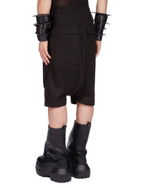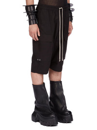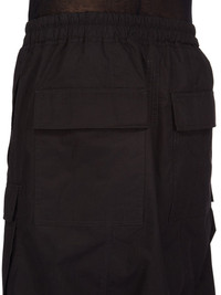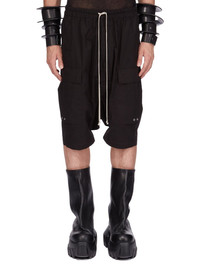 RICK OWENS SS25 HOLLYWOOD CARGO PODS IN BLACK COTTON POPLIN THESE CARGO PODS ARE BELOW-KNEE LENGTH WITH AN EXTREME LOW CROTCH. THEY HAVE AN ELASTICIZED WAISTBAND WITH DRAWSTRING AND SIDE SEAM POCKETS. THEY FEATURE TWO BIG BEVELED CARGO POCKETS ON THE OUTER THIGH WITH FLAPS AND SMALL SILVER EYELET DETAIL, AND TWO SQUARE BACK POCKETS WITH FLAPS THIS LIGHTWEIGHT CLASSIC POPLIN FABRIC HAS A SOFT HANDFEEL AND WASHED FINISH. THIS FABRIC IS MADE USING GOTS CERTIFIED ORGANIC COTTON WHICH MEANS THE NATURAL FIBER IS GROWN WITHOUT HARMFUL CHEMICALS, LEAVING OUR SOIL, AIR AND WATER CLEANER FROM CONTAMINATES COLOR: BLACK MATERIAL: 100% COTTON BUTTONS 100% BUFFALO HORN MODEL IS 189CM TALL MODEL WEARS SIZE 48