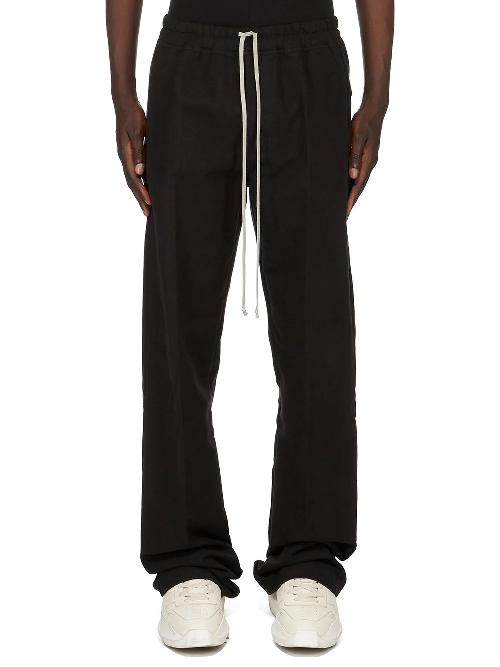 RICK OWENS FW25 CONCORDIANS DIETRICH DRAWSTRING IN BLACK BRUSHED HEAVY TWILL THESE DIETRICH DRAWSTRINGS ARE FULL-LENGTH WITH A LOOSE STRAIGHT LEG. THEY HAVE AN ELASTICIZED WAISTBAND WITH DRAWSTRING, AND A STITCHED FLY. THEY HAVE SIDE SEAM POCKETS AND TWO REAR SQUARE PATCH POCKETS WITH FLAPS THIS MEDIUMWEIGHT COTTON TWILL FABRIC HAS A SOFT BRUSHED HANDFEEL THIS FABRIC IS MADE USING GOTS CERTIFIED ORGANIC COTTON WHICH MEANS THE NATURAL FIBER IS GROWN WITHOUT HARMFUL CHEMICALS, LEAVING OUR SOIL, AIR AND WATER CLEANER FROM CONTAMINATES COLOR: BLACK MATERIAL: 100% COTTON BAND 97% COTTON + 3% ELASTANE BUTTONS 100% BUFFALO HORN MODEL IS 189CM TALL MODEL WEARS SIZE 48