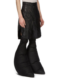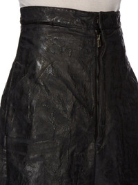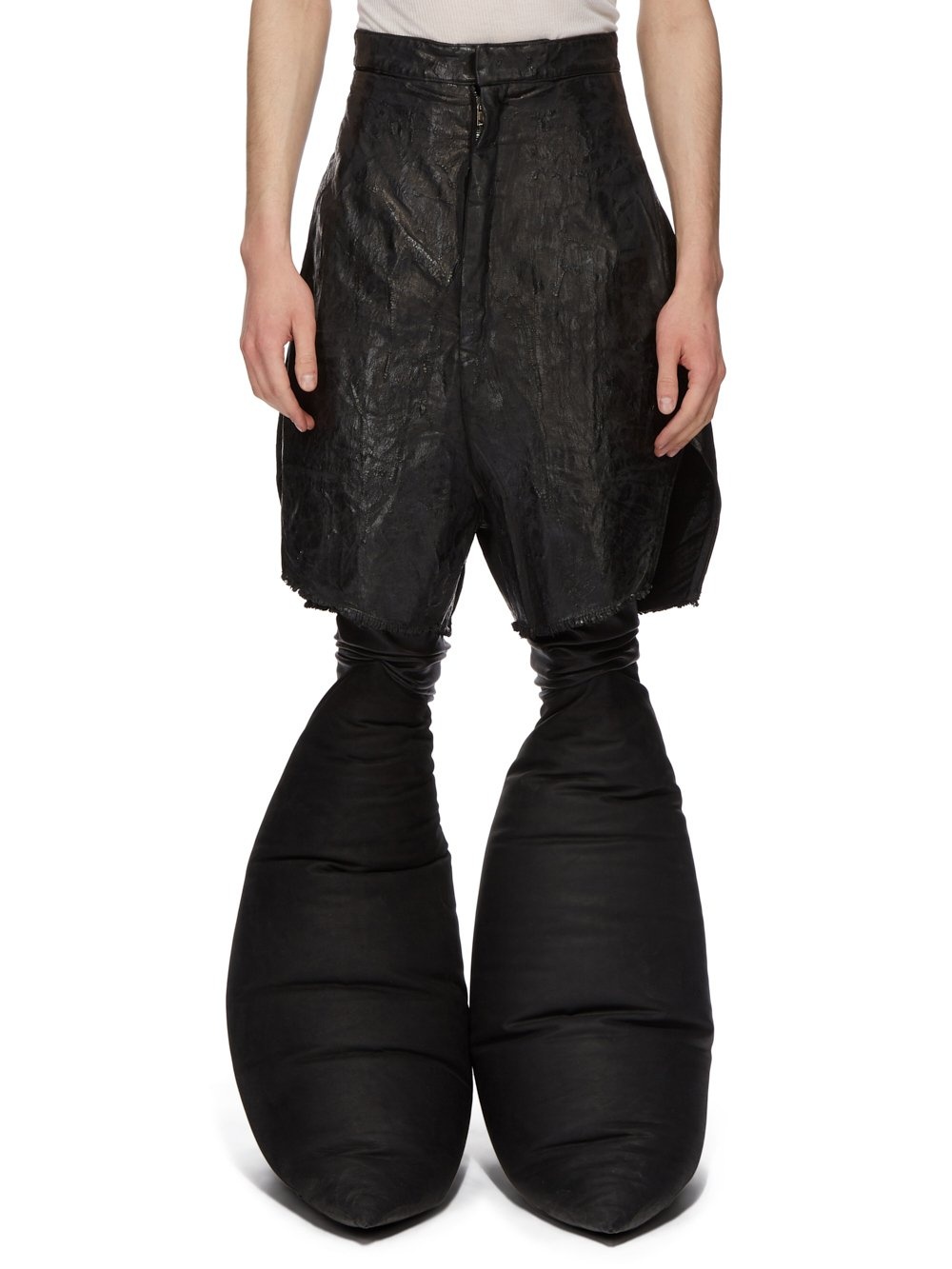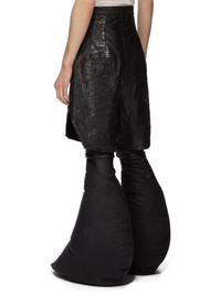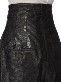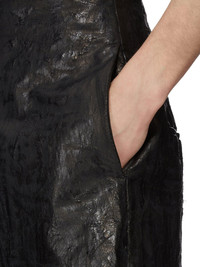 RICK OWENS FW24 PORTERVILLE RUNWAY PTRVILLE CUTOFFS IN BLACK 13OZ MEGACRUST TURBO DENIM THIS PORTERVILLE CUT-OFFS ARE MID-THIGH LENGTH, WITH AN EXTREME HIGH WAIST. THEY HAVE A TAILORED WAISTBAND WITH WRAP AND CONCEALED FLY, SIDE SEAM POCKETS, REAR JET POCKETS AND BEVELLED SPLITS IN THE HEM, AT THE SIDE SEAMS THIS HEAVYWEIGHT MEGACRUST TURBO DENIM IS MADE ON A 13OZ BLACK AND NATURAL JAPANESE DENIM. THE READY GARMENT IS OVERDYED BLACK AND TREATED WITH A WAX FINISH, THEN SEVERAL LAYERS OF BLACK FOIL IS PRESSED ON TOP AND A FINAL WASH MAKES THE FOIL PEEL AND CRACK. THE NATURAL ASPECTS OF THIS TREATMENT MEANS THE FOIL HAS PEELED OFF AND CRACKED IN CERTAIN AREAS AND WILL CONTINUE TO DO SO WITH WEAR AND ABRASION. THIS IS AN INHERENT CHARACTERISTIC OF THIS TYPE OF TREATMENT AND IS A DESIRED A VISUAL ASPECT WHICH ADDS TO THE UNIQUENESS OF EACH PIECE. - COLOR: BLACK - MATERIAL: 100% COTTON - POCKETS LINING 52% POLYESTER + 48% COTTON - BUTTONS 100% BUFFALO HORN - MODEL IS 189CM TALL - MODEL WEARS SIZE 48
