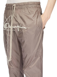 CHAMPION X RICK OWENS JOGGERS IN DUST GREY RECYCLED NYLON THESE JOGGERS ARE FULL-LENGTH WITH A SLIM FIT. THEY FEATURE AN ELASTICIZED WAISTBAND WITH DRAWSTRING, SIDE POCKETS, BACK WELT POCKETS AND RIBBED ANKLE CUFFS. THEY HAVE A 3D EMBROIDERED SIGNATURE RICK OWENS X CHAMPION PENTAGRAM LOGO ACROSS FRONT AND A CHAMPION LOGO ON THE BACK LEFT HIP A LIGHTWEIGHT AND AIRY PARACHUTE-LIKE MATERIAL WOVEN FROM GRS CERTIFIED RECYCLED NYLON. WE CHOSE TO MAKE THIS PRODUCT FROM CERTIFIED RECYCLED POLYAMIDE BECAUSE IT ENSURES A REDUCTION IN WATER CONSUMPTION, EMISSIONS AND HAZARDOUS WASTE, LESSENING THE DEPENDENCE ON NON-RENEWABLE RESOURCES - COLOR: DUST GREY - MATERIAL: 100% NYLON - MODEL IS WEARING SIZE S - MODEL IS 189 CM TALL
