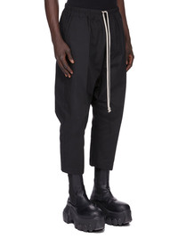 RICK OWENS FOREVER DRAWSTRING CROPPED IN BLACK HEAVY COTTON POPLIN THESE DRAWSTRING CROPPED PANTS ARE ABOVE-ANKLE LENGTH WITH A DROPPED CROTCH. THEY HAVE AN ELASTICIZED WAISTBAND WITH DRAWSTRING, A CONCEALED FLY, AND PRESSED CREASES ON THE FRONT AND BACK LEG. THEY FEATURE TWO SIDE FRONT POCKETS AND TWO SQUARE BACK POCKETS WITH FLAPS AND TOPSTITCHING THIS MEDIUMWEIGHT COTTON POPLIN HAS A CRISP HANDFEEL AND WASHED FINISH THIS FABRIC IS MADE USING GOTS CERTIFIED ORGANIC COTTON WHICH MEANS THE NATURAL FIBER IS GROWN WITHOUT HARMFUL CHEMICALS, LEAVING OUR SOIL, AIR AND WATER CLEANER FROM CONTAMINATES - COLOR:BLACK - MATERIAL: 97% COTTON 3% ELASTANE - MODEL IS WEARING SIZE 48 - MODEL IS 189 CM TALL