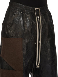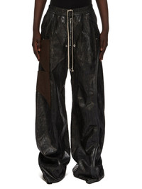 RICK OWENS FW24 PORTERVILLE RUNWAY WIDE BELA PANTS IN BLACK/BROWN/BLACK 13OZ MEGACRUST TURBO DENIM, LODEN FELT AND RECYCLED TYRE THESE WIDE BELA PANTS ARE FULL-LENGTH PANTS WITH A LOW CROTCH AND WIDE LEG WITH CREASES IN THE FRONT AND BACK LEG. THEY FEATURE AN ELASTICIZED WAISTBAND DRAWSTRING AND A BELA EXPOSED CENTRE ZIPPER WITH TWO SNAP DETAIL AT BOTTOM. THEY HAVE SIDE POCKETS WITH EYELET AND RIVET DETAIL AND BACK POCKETS WITH FLAPS AND SNAP CLOSURES THIS IS A COMBINATION OF 13OZ MEGACRUST TURBO DENIM, LODEN FELT AND RECYCLED TYRE. THIS HEAVYWEIGHT MEGACRUST TURBO DENIM IS MADE ON A 13OZ BLACK AND NATURAL JAPANESE DENIM. THE READY GARMENT IS OVERDYED BLACK AND TREATED WITH A WAX FINISH, THEN SEVERAL LAYERS OF BLACK FOIL IS PRESSED ON TOP AND A FINAL WASH MAKES THE FOIL PEEL AND CRACK. THE NATURAL ASPECTS OF THIS TREATMENT MEANS THE FOIL HAS PEELED OFF AND CRACKED IN CERTAIN AREAS AND WILL CONTINUE TO DO SO WITH WEAR AND ABRASION. THIS IS AN INHERENT CHARACTERISTIC OF THIS TYPE OF TREATMENT AND IS A DESIRED A VISUAL ASPECT WHICH ADDS TO THE UNIQUENESS OF EACH PIECE. - COLOR: BLACK/BROWN/BLACK - MATERIAL: 100% COTTON - BAND 91% COTTON + 6% ELASTOMULTIESTER + 3% RUBBER - EXTERNAL POCKETS 100% NEW WOOL - MODEL IS 189CM TALL - MODEL WEARS SIZE 48