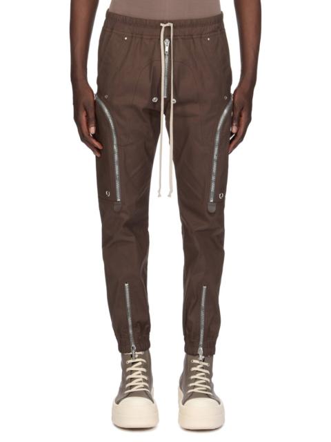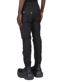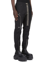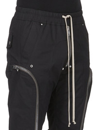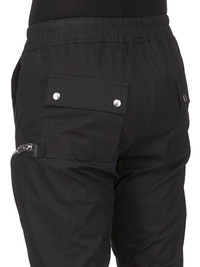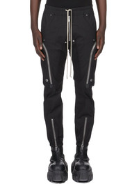 RICK OWENS SS26 TEMPLE BAUHAUS CARGO IN BLACK HEAVY POPLIN THESE BAUHAUS CARGO PANTS ARE FULL LENGTH, WITH A SLIM FIT, AND AN ELASTICIZED WAISTBAND WITH DRAWSTRING. THEY FEATURE A BELA EXPOSED CENTER ZIPPER WITH SNAP DETAIL AT BOTTOM, ROUNDED BAUHAUS ZIPPERED POCKETS ON BOTH THIGHS WITH EYELETS, FRONT SHIN SPLITS WITH ZIPPERS AND ELASTICIZED CUFFS. THEY HAVE SIDE FRONT WELT POCKETS WITH RIVET DETAIL, SQUARE BACK POCKETS WITH FLAPS AND SNAPS, AND FRONT YOKES AND SEAMS WITH DOUBLE TOP STITCHING THIS MEDIUMWEIGHT COTTON POPLIN HAS A CRISP HANDFEEL AND WASHED FINISH THIS FABRIC IS MADE USING GOTS CERTIFIED ORGANIC COTTON WHICH MEANS THE NATURAL FIBRE IS GROWN WITHOUT HARMFUL CHEMICALS, LEAVING OUR SOIL, AIR AND WATER CLEANER FROM CONTAMINATES COLOR: BLACK MATERIAL:97% COTTON + 3% ELASTANE POCKETS TONGUE 100% COW LEATHER MODEL IS 189CM TALL MODEL WEARS SIZE 48