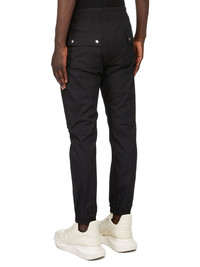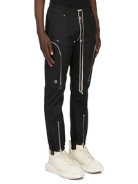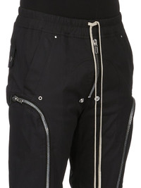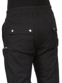 RICK OWENS FW25 CONCORDIANS BAUHAUS CARGO IN BLACK HEAVY COTTON POPLIN THESE BAUHAUS CARGO PANTS ARE FULL LENGTH WITH A SLIM FIT. THEY HAVE AN ELASTICIZED WAISTBAND WITH DRAWSTRING, A BELA EXPOSED CENTRE ZIPPER WITH SNAP DETAIL AT BOTTOM, ROUNDED BAUHAUS ZIPPERED POCKETS ON BOTH THIGHS WITH EYELETS, FRONT SHIN SPLITS WITH ZIPPERS AND ELASTICATED CUFFS. THEY HAVE SIDE FRONT WELT POCKETS WITH RIVET DETAIL, SQUARE BACK POCKETS WITH FLAPS AND SNAPS, AND FRONT YOKES AND SEAMS WITH DOUBLE TOP STITCHING THIS MEDIUMWEIGHT COTTON POPLIN HAS A CRISP HANDFEEL AND WASHED FINISH THIS FABRIC IS MADE USING GOTS CERTIFIED ORGANIC COTTON WHICH MEANS THE NATURAL FIBER IS GROWN WITHOUT HARMFUL CHEMICALS, LEAVING OUR SOIL, AIR AND WATER CLEANER FROM CONTAMINATES COLOR: BLACK MATERIAL: 97% COTTON + 3% ELASTANE POCKETS TONGUE 100% COW LEATHER MODEL IS 189CM TALL MODEL WEARS SIZE 48