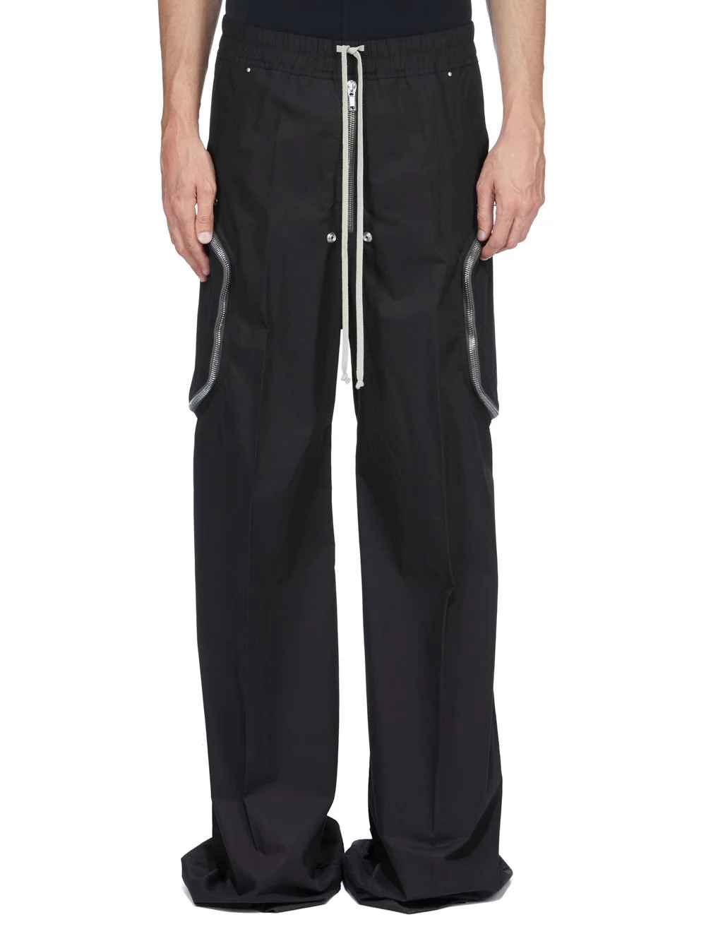 RICK OWENS SS26 TEMPLE HEIZER BELAS IN BLACK COTTON POPLIN THESE BLIXA BELAS ARE FULL LENGTH WITH A LOOSE FIT AND A DROPPED CROTCH. THEY HAVE AN ELASTICIZED WAISTBAND WITH DRAWSTRING, A BELA FLY WITH EXPOSED CENTER ZIPPER AND SNAP DETAIL AT BOTTOM. THEY FEATURE BLIXA, TWO-WAY ZIPPERED POCKETS ON EACH THIGH, AND HAVE SIDE WELT POCKETS WITH EYELET AND RIVET DETAIL AND BACK POCKETS WITH CONCEALED SNAPS THIS LIGHTWEIGHT CLASSIC POPLIN FABRIC HAS A SOFT HANDFEEL AND WASHED FINISH THIS FABRIC IS MADE USING GOTS CERTIFIED ORGANIC COTTON WHICH MEANS THE NATURAL FIBRE IS GROWN WITHOUT HARMFUL CHEMICALS, LEAVING OUR SOIL, AIR AND WATER CLEANER FROM CONTAMINATES COLOR: BLACK MATERIAL:100% COTTON MODEL IS 189CM TALL MODEL WEARS SIZE 48
