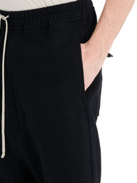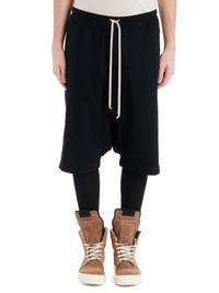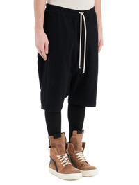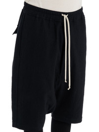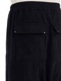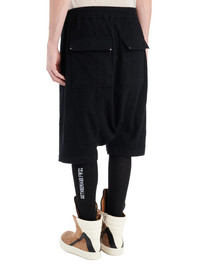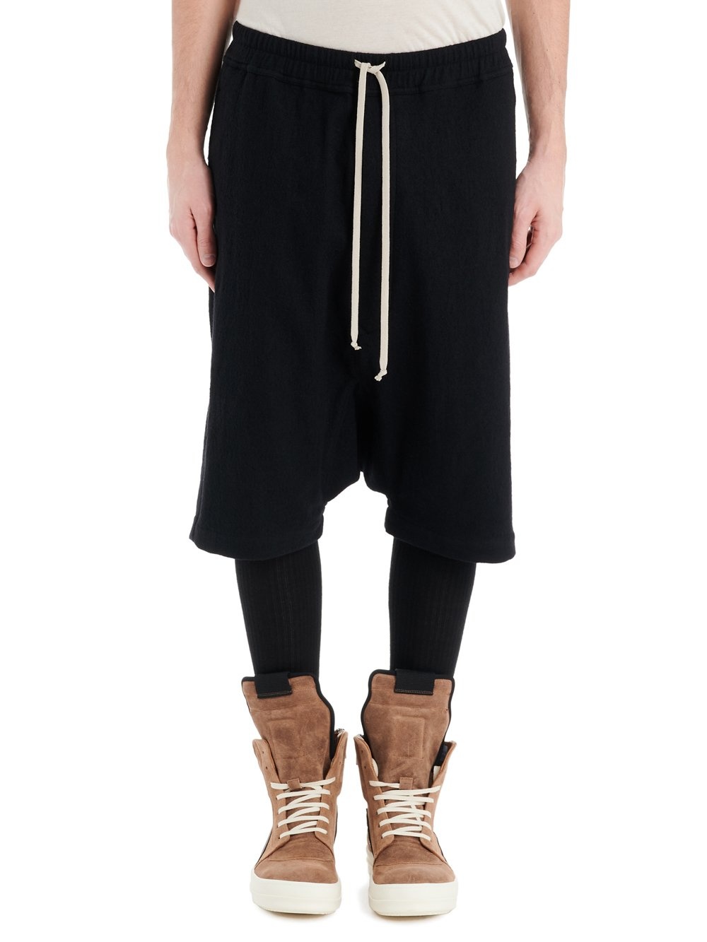RICK OWENS FW21 GETHSEMANE RICK’S PODS IN COTTON WOOL FLANNEL THESE RICK'S PODS ARE BELOW THE KNEE LENGTH SHORTS WITH A LOW DROPPED CROTCH. THEY HAVE AN ELASTICATED WAISTBAND WITH DRAWSTRING, CONCEALED FLY, TWO SIDE POCKETS AND TWO SQUARE BACK POCKETS WITH FLAPS AND RIVET DETAIL. THEY HAVE A ROUNDED PANEL BETWEEN THE LEGS AND DOUBLE TOPSTITCHING THIS MATERIAL IS A BRUSHED COTTON WOOL FLANNEL WOVEN IN JAPAN - COLOR: BLACK - MATERIAL: 52% COTTON, 48% WOOL - MODEL IS WEARING SIZE 48 - MODEL IS 189 CM TALL