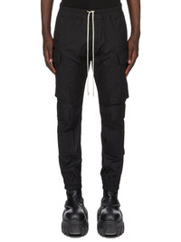 RICK OWENS FW25 CONCORDIANS MASTODON MEGACARGO IN BLACK HEAVY COTTON POPLIN THESE MASTODON MEGACARGO PANTS ARE FULL LENGTH WITH A SLIM FIT AND AN ELASTICIZED WAIST WITH DRAWSTRING AND ELASTICATED ANKLES. THEY FEATURE TWO SQUARE CARGO POCKETS ON THE THIGH, WITH TWO BEVELED CARGO POCKETS BELOW, AND TWO SQUARE BACK POCKETS, ALL HAVE FLAPS WITH HOOK AND LOOP FASTENINGS AND TOPSTITCHING THIS MEDIUMWEIGHT COTTON POPLIN HAS A CRISP HANDFEEL AND WASHED FINISH THIS FABRIC IS MADE USING GOTS CERTIFIED ORGANIC COTTON WHICH MEANS THE NATURAL FIBER IS GROWN WITHOUT HARMFUL CHEMICALS, LEAVING OUR SOIL, AIR AND WATER CLEANER FROM CONTAMINATES COLOR: BLACK MATERIAL: 97% COTTON + 3% ELASTANE BUTTONS 100% BUFFALO HORN MODEL IS 189CM TALL MODEL WEARS SIZE 48