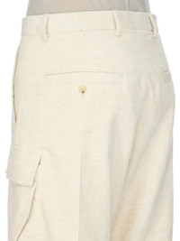 RICK OWENS FW25 CONCORDIANS TAILORED CARGOBELAS IN NATURAL LINEN CORDUROY THESE TAILORED CARGOBELAS ARE FULL-LENGTH WITH A LOW CROTCH AND WIDE LEG. THEY FEATURE A WAISTBAND WITH BELT LOOPS, BUTTON CLOSURE AND A BELA EXPOSED CENTER ZIPPER WITH TWO SNAP DETAIL AT BOTTOM. THEY HAVE SIDE WELT POCKETS WITH RIVET AND EYELET DETAIL, FOUR BEVELED CARGO POCKETS ON THE SIDE LEG AND TWO REAR WELT POCKETS WITH VISIBLE BUTTON CLOSURE AND TOPSTITCHING THIS MEDIUMWEIGHT COTTON AND LINEN BLEND CORDUROY HAS A SOFT HANDFEEL THE COLOR OF THIS CORDUROY IS NATURAL WITH SLUBS AND IMPURITIES VISIBLE AS A PART OF THE COLORATION THIS FABRIC IS MADE USING GOTS CERTIFIED ORGANIC COTTON WHICH MEANS THE NATURAL FIBER IS GROWN WITHOUT HARMFUL CHEMICALS, LEAVING OUR SOIL, AIR AND WATER CLEANER FROM CONTAMINATES COLOR: NATURAL MATERIAL: 74% COTTON + 26% LINEN BUTTONS 100% BUFFALO HORN MODEL IS 189CM TALL MODEL WEARS SIZE 48