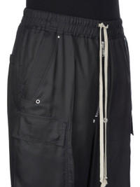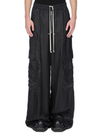 RICK OWENS FW25 CONCORDIANS CARGOBELAS IN BLACK CUPRO TWILL THESE CARGOBELAS PANTS ARE FULL-LENGTH WITH A LOW CROTCH AND WIDE LEG. THEY FEATURE AN ELASTICIZED WAISTBAND WITH DRAWSTRING AND A BELA EXPOSED CENTER ZIPPER WITH TWO SNAP DETAIL AT BOTTOM. THEY HAVE SIDE WELT POCKETS WITH RIVET AND EYELET DETAIL, FOUR BEVELED CARGO POCKETS ON THE SIDE LEG AND TWO REAR WELT POCKETS WITH CONCEALED SNAPS AND TOPSTITCHING. THIS LIGHTWEIGHT AND FLUID CUPRO TWILL HAS A GLOSSY SURFACE AND A SOFT, WASHED HANDFEEL. THIS FABRIC IS MADE USING CUPRO WHICH IS BIODEGRADABLE AND 100% PLANT BASED. AS IT’S MADE FROM COTTON WASTE, CUPRO HELPS FIND A PURPOSE TO FIBERS THAT WOULD OTHERWISE BE DISCARDED. COLOR: BLACK MATERIAL: 100% CUPRO MODEL IS 189CM TALL MODEL WEARS SIZE 48