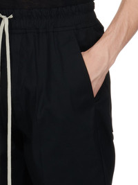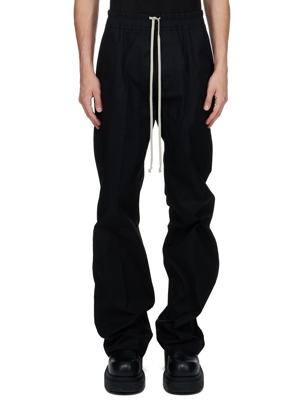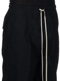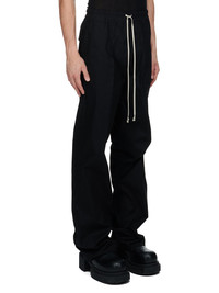 RICK OWENS FW24 PORTERVILLE DIETRICH DRAWSTRING IN BLACK HEAVY COTTON POPLIN THESE DIETRICH DRAWSTRING ARE FULL-LENGTH WITH A LOOSE STRAIGHT LEG. THEY HAVE AN ELASTICIZED WAISTBAND WITH DRAWSTRING, AND A STITCHED FLY. THEY HAVE SIDE SEAM POCKETS AND TWO REAR SQUARE PATCH POCKETS WITH FLAPS THIS MEDIUMWEIGHT COTTON POPLIN HAS A CRISP HANDFEEL AND WASHED FINISH THIS FABRIC IS MADE USING GOTS CERTIFIED ORGANIC COTTON WHICH MEANS THE NATURAL FIBER IS GROWN WITHOUT HARMFUL CHEMICALS, LEAVING OUR SOIL, AIR AND WATER CLEANER FROM CONTAMINATES - COLOR: BLACK - MATERIAL: 97% COTTON + 3% ELASTANE - BUTTONS 100% BUFFALO HORN - MODEL IS 189CM TALL - MODEL WEARS SIZE 48