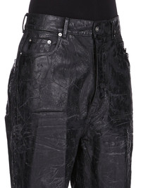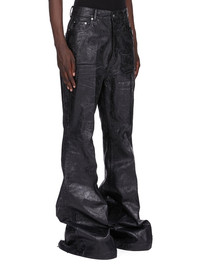RICK OWENS FW25 CONCORDIANS RUNWAY BOLANS IN 13OZ BLACK MEGACRUST DENIM THESE BOLANS ARE A HIGH WAISTED, SLIM FIT 6-POCKET JEAN WITH A FLOOR-LENGTH BOOT CUT. THEY CLOSE WITH A WAIST BUTTON AND CONCEALED BUTTON FLY. THEY HAVE A WAISTBAND WITH BELT LOOPS AND POCKET RIVETS AND BACK PATCH POCKETS WITH TOPSTITCHING. THIS MEDIUMWEIGHT MEGACRUST DENIM IS MADE ON A 13OZ BLACK AND NATURAL JAPANESE DENIM. THE READY GARMENT IS OVERDYED BLACK AND TREATED WITH A WAX FINISH, THEN SEVERAL LAYERS OF BLACK FOIL IS PRESSED ON TOP AND A FINAL WASH MAKES THE FOIL PEEL AND CRACK. THE NATURAL ASPECTS OF THIS TREATMENT MEANS THE FOIL HAS PEELED OFF AND CRACKED IN CERTAIN AREAS AND WILL CONTINUE TO DO SO WITH WEAR AND ABRASION. THIS IS AN INHERENT CHARACTERISTIC OF THIS TYPE OF TREATMENT AND IS A DESIRED A VISUAL ASPECT WHICH ADDS TO THE UNIQUENESS OF EACH PIECE. THIS GARMENT IS TREATED IN AN ITALIAN WASH HOUSE BASED IN THE VENETO AREA OF ITALY, THAT PRODUCES IN SMALLER TREATMENT BATHS TO REDUCE WATER WASTE AND UTILIZE A WATER PURIFYING PROCESS THAT ENABLES THEM TO RECYCLE A PORTION OF THE WATER USED. ALL OF OUR DENIM WASHES ARE ZDHC CERTIFIED. COLOR: BLACK MATERIAL: 100% COTTON POCKETS LINING 52% POLYESTER + 48% COTTON MODEL IS 189CM TALL MODEL WEARS SIZE 31