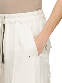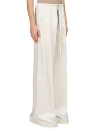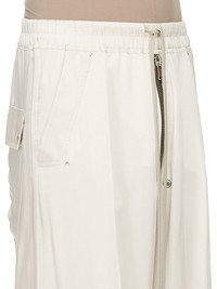 RICK OWENS SS25 HOLLYWOOD RUNWAY WIDE BELA PANTS IN DINGE WASHED CHARMEUSE THESE WIDE BELA PANTS ARE FULL-LENGTH WITH A LOW CROTCH AND WIDE LEG. THEY FEATURE AN ELASTICIZED WAISTBAND WITH DRAWSTRING AND A BELA EXPOSED CENTER ZIPPER WITH TWO SNAP DETAIL AT BOTTOM. THEY HAVE SIDE WELT POCKETS WITH RIVET AND EYELET DETAIL AND BACK POCKETS WITH FLAPS AND SNAP CLOSURES THIS LIGHTWEIGHT AND FLUID CHARMEUSE IS HAS A SEMI-SHINY SURFACE AND WASHED FINISH. THIS FABRIC IS MADE FROM CERTIFIED VISCOSE WHICH ENSURES THAT THE FIBERS ARE PRODUCED FROM RESPONSIBLY MANAGED SOURCES AND NO DEFORESTATION OCCURS COLOR: DINGE MATERIAL: 61% ACETATE + 39% VISCOSE MODEL IS 189CM TALL MODEL WEARS SIZE 48