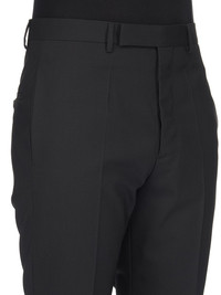RICK OWENS FW23 LUXOR NEW SLIM ASTAIRE IN BLACK PAPER FINISH WOOL THESE NEW SLIM ASTAIRES ARE FULL-LENGTH PANTS WITH AN EXTRA SLIM FIT AND REGULAR CROTCH. THEY HAVE A CLASSIC WAISTBAND WITH BELT LOOPS, WRAP BUTTON AND ZIPPER CLOSURE. THEY HAVE TWO SIDE SLIT POCKETS, TWO BACK WELT POCKETS WITH BUTTONS, AND PRESSED CREASES ON THE FRONT AND BACK LEG THIS MEDIUMWEIGHT WOOL FABRIC HAS A DRY PAPERY HANDFEEL. IT IS WOVEN IN THE BIELLA REGION OF ITALY RENOWNED FOR ITS LONG TRADITION OF TAILORED WOOL. THIS FABRIC IS MADE FROM ZQ CERTIFIED VIRGIN WOOL WHICH ENSURES A HIGH STANDARD IN ANIMAL WELFARE, ENVIRONMENTAL SUSTAINABILITY AND SOCIAL RESPONSIBILITY. EACH BALE OF WOOL IS TRACEABLE BACK TO ITS SOURCE. - COLOR: BLACK - MATERIAL: 96% NEW WOOL + 4% ELASTANE - LINING 100% CUPRO - BUTTONS 100% BUFFALO HORN - MODEL IS WEARING SIZE 48 - MODEL IS 189 CM TALL