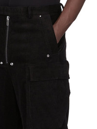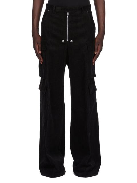RICK OWENS FW25 CONCORDIANS TAILORED CARGOBELAS IN BLACK LINEN CORDUROY THESE TAILORED CARGOBELAS ARE FULL-LENGTH WITH A LOW CROTCH AND WIDE LEG. THEY FEATURE A WAISTBAND WITH BELT LOOPS, BUTTON CLOSURE AND A BELA EXPOSED CENTER ZIPPER WITH TWO SNAP DETAIL AT BOTTOM. THEY HAVE SIDE WELT POCKETS WITH RIVET AND EYELET DETAIL, FOUR BEVELED CARGO POCKETS ON THE SIDE LEG AND TWO REAR WELT POCKETS WITH VISIBLE BUTTON CLOSURE AND TOPSTITCHING THIS MEDIUMWEIGHT COTTON AND LINEN BLEND CORDUROY HAS A SOFT HANDFEEL THIS FABRIC IS MADE USING GOTS CERTIFIED ORGANIC COTTON WHICH MEANS THE NATURAL FIBER IS GROWN WITHOUT HARMFUL CHEMICALS, LEAVING OUR SOIL, AIR AND WATER CLEANER FROM CONTAMINATES COLOR: BLACK MATERIAL: 74% COTTON + 26% LINEN BUTTONS 100% BUFFALO HORN MODEL IS 189CM TALL MODEL WEARS SIZE 48