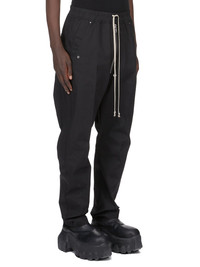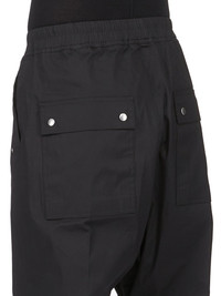 RICK OWENS SS26 TEMPLE BELA PANTS IN BLACK HEAVY POPLIN THESE BELA PANTS ARE FULL LENGTH WITH A LOOSE FIT AND A DROPPED CROTCH. THEY HAVE AN ELASTICIZED WAISTBAND WITH DRAWSTRING, A BELA FLY WITH EXPOSED CENTER ZIPPER AND SNAP DETAIL AT BOTTOM, SIDE WELT POCKETS WITH EYELET AND RIVET DETAIL AND BACK POCKETS WITH FLAPS AND SNAPS. THIS MEDIUMWEIGHT COTTON POPLIN HAS A CRISP HANDFEEL AND WASHED FINISH. THIS FABRIC IS MADE USING GOTS CERTIFIED ORGANIC COTTON WHICH MEANS THE NATURAL FIBRE IS GROWN WITHOUT HARMFUL CHEMICALS, LEAVING OUR SOIL, AIR AND WATER CLEANER FROM CONTAMINATES. COLOR: BLACK MATERIAL:97% COTTON + 3% ELASTANE MODEL IS 189CM TALL MODEL WEARS SIZE 48