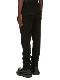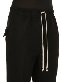 RICK OWENS FW23 LUXOR DRAWSTRING LONG IN BLACK SOFT WOOL FLANNEL THESE DRAWSTRING LONG PANTS ARE FULL LENGTH WITH A DROPPED CROTCH. THEY HAVE AN ELASTICIZED WAISTBAND WITH DRAWSTRING, A CONCEALED FLY, AND PRESSED CREASES ON THE FRONT AND BACK LEG. THEY FEATURE TWO SIDE FRONT POCKETS AND TWO SQUARE BACK POCKETS WITH FLAPS AND TOPSTITCHING THIS MEDIUMWEIGHT WOOL FLANNEL HAS A TEXTURED SURFACE AND SOFT HANDFEEL. IT IS ACHIEVED BY FULLING, A PROCESS WHERE THE FABRIC IS WASHED, PRESSED AND DRIED IN ORDER TO MAKE THE FABRIC MORE COMPACT AND FELTED. - COLOR: BLACK - MATERIAL: 100% NEW WOOL - BUTTONS 100% BUFFALO HORN - MODEL IS WEARING SIZE 48 - MODEL IS 189 CM TALL