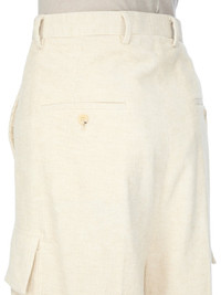 RICK OWENS FW25 CONCORDIANS FIRBANKS IN NATURAL LINEN CORDUROY THESE FIRBANKS ARE A FLOOR LENGTH WITH TWO LARGE LOWER THIGH CARGO POCKETS WITH FLAPS. THEY FEATURE A WAISTBAND WITH CONCEALED FRONT ZIPPER AND BELT LOOPS, SIDE POCKETS AND BACK POCKETS WITH BUTTONS THIS MEDIUMWEIGHT COTTON AND LINEN BLEND CORDUROY HAS A SOFT HANDFEEL THE COLOR OF THIS CORDUROY IS NATURAL WITH SLUBS AND IMPURITIES VISIBLE AS A PART OF THE COLORATION THIS FABRIC IS MADE USING GOTS CERTIFIED ORGANIC COTTON WHICH MEANS THE NATURAL FIBER IS GROWN WITHOUT HARMFUL CHEMICALS, LEAVING OUR SOIL, AIR AND WATER CLEANER FROM CONTAMINATES COLOR: NATURAL MATERIAL: 74% COTTON + 26% LINEN BUTTONS 100% BUFFALO HORN MODEL IS 189CM TALL MODEL WEARS SIZE 48