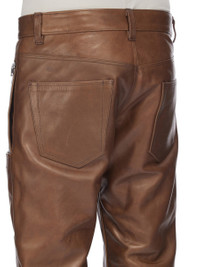 RICK OWENS FW25 CONCORDIANS RUNWAY HEADON JEANS IN BROWN HYBRID HORSE LEATHER THESE HEADON JEANS ARE ANKLE LENGTH AND HAVE A STRAIGHT FIT. THEY HAVE A CONCEALED ZIP FLY WITH TOP BUTTON, SIDE POCKETS, DIAGONAL STROBE ZIPPERED POCKETS, VERTICAL UTILITY POCKETS, AND REAR POCKETS WITH FLAPS. THEY HAVE SIDE KNEE ZIPS THAT CAN BE WORN OPEN AND FRONT SHIN ZIPPERS, ALLOWING THEM ALLOWS TO BE WORN STRAIGHT OR TAPERED. THIS HEAVYWEIGHT HORSE LEATHER IS TANNED IN JAPAN. THE TANNING AND DYING METHOD OF THIS LEATHER WILL REVEAL THE BROWN COLOURED UNDERLAYER OF THE HIDE AS THE DARKER OUTER LAYER FADES WITH WEAR AND ABRASION. THE HIDES HAVE BEEN SPECIFICALLY CHOSEN FOR THE NATURAL SCARRING AND MARKINGS OF THE ANIMAL. COLOR: BROWN MATERIAL: 100% HORSE LEATHER LINING 50% COTTON + 50% CUPRO MODEL IS 189CM TALL MODEL WEARS SIZE 48