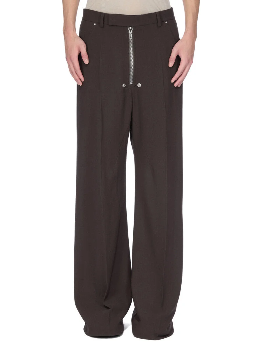 RICK OWENS FW25 CONCORDIANS TAILORED WIDE BELAS IN DARKDUST WOOL SABLE THESE TAILORED WIDE BELAS ARE FULL-LENGTH WITH A LOW CROTCH AND WIDE LEG. THEY FEATURE A WAISTBAND WITH BELT LOOPS, BUTTON CLOSURE AND A BELA EXPOSED CENTER ZIPPER WITH TWO SNAP DETAIL AT BOTTOM. THEY HAVE SIDE WELT POCKETS WITH RIVET AND EYELET DETAIL AND TWO REAR WELT POCKETS WITH SNAPS AND TOPSTITCHING. THIS MEDIUMWEIGHT WOOL SABLE FABRIC IS WOVEN WITH HIGH TWIST CREPE YARNS THAT CREATE A DRY HANDFEEL AND TEXTURED SURFACE. IT IS WOVEN IN THE BIELLA REGION OF ITALY RENOWNED FOR ITS LONG TRADITION OF TAILORED WOOL. THIS FABRIC IS MADE FROM ZQ CERTIFIED VIRGIN WOOL WHICH ENSURES A HIGH STANDARD IN ANIMAL WELFARE, ENVIRONMENTAL SUSTAINABILITY AND SOCIAL RESPONSIBILITY. EACH BALE OF WOOL IS TRACEABLE BACK TO ITS SOURCE. COLOR: DARKDUST MATERIAL: 100% NEW WOOL LINING 100% CUPRO BUTTONS 100% BUFFALO HORN MODEL IS 189CM TALL MODEL WEARS SIZE 48