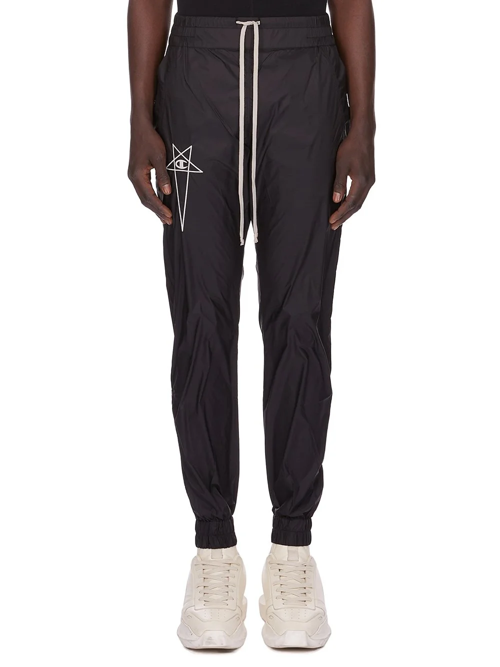 CHAMPION X RICK OWENS SS25 JOGGERS IN BLACK LIGHT NYLON THEY HAVE A 3D EMBROIDERED SIGNATURE CHAMPION X RICK OWENS PENTAGRAM LOGO ACROSS FRONT AND A CHAMPION LOGO ON THE BACK HIP THIS AIRY AND LIGHTWEIGHT NYLON IS MADE USING CERTIFIED RECYCLED NYLON WHICH ENSURES A REDUCTION IN WATER CONSUMPTION, EMISSIONS AND HAZARDOUS WASTE, LESSENING THE DEPENDENCE ON NON-RENEWABLE RESOURCES COLOR: BLACKMATERIAL: 100% POLYAMIDE MODEL WEARS SIZE M MODEL IS 189CM TALL