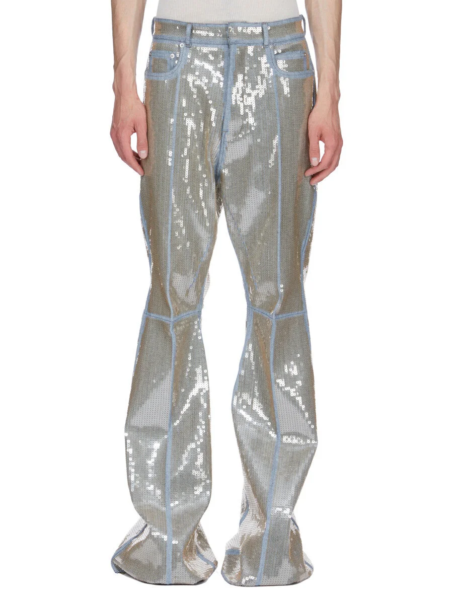 RICK OWENS SS26 TEMPLE BOLAN BOOTCUT IN BLUE/SAND SEQUIN EMBROIDERED STRETCH DENIM THIS BOLAN BOOTCUT IS A HIGH WAISTED, SLIM FIT, 5 POCKET JEAN WITH A FLOOR-LENGTH BOOT CUT. THEY HAVE A CONCEALED BUTTON FLY AND A WAISTBAND WITH CENTER BUTTON, BELT LOOPS AND POCKET RIVETS AND BACK PATCH POCKETS WITH TOPSTITCHING. THIS LIGHTWEIGHT STRETCH DENIM IS EMBROIDERED WITH SMALL ORNAMENTAL SEQUIN DISKS. COLOR: BLUE/SAND MATERIAL:91% COTTON + 6% ELASTOMULTIESTER + 3% RUBBER FIBER POCKETS LINING 100% COTTON EMBROIDERY 100% POLYESTER MODEL IS 189CM TALL MODEL WEARS SIZE 31