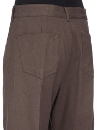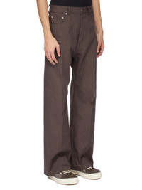 RICK OWENS FW25 CONCORDIANS RUNWAY GETH JEANS IN ASH COTTON WHIPCORD THESE GETH JEANS ARE A FULL LENGTH 5 POCKET JEAN WITH A LOW-RISE AND WIDE FIT. THEY HAVE A SILVER BUTTON FLY, BELT LOOPS AND POCKET RIVETS. THIS MEDIUMWEIGHT COTTON WHIPCORD HAS A VISIBLE TWILL STRUCTURE AND A DRY HANDFEEL. IT IS WOVEN USING RAW COTTON YARNS MEANING IRREGULAR SLUBS ARE VISIBLE THROUGHOUT THE WEAVE. THE FABRIC HAS MINIMAL FINISHING IN ORDER TO KEEP THE NATURAL CHARACTERISTICS OF THE COTTON YARN. THIS FABRIC WAS WOVEN ON A 1950’S VINTAGE SHUTTLE LOOM BY BONOTTO, A 4TH GENERATION TEXTILE MILL FOUNDED IN 1912 SITUATED JUST BELOW THE PREALPS IN VENETO, ITALY. COLOR: ASH MATERIAL:100% COTTON MODEL IS 189CM TALL MODEL WEARS SIZE 31