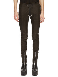 RICK OWENS FW24 PORTERVILLE TIGHT GARY PANTS IN BLACK STRETCH GOAT LEATHER THESE TIGHT GARY PANTS ARE FULL-LENGTH WITH A SKIN TIGHT FIT. THEY HAVE A SNAP FRONT TAB, BELA ZIPPER CLOSURE WITH TWO SNAP DETAIL AT BOTTOM, A ZIPPER ACROSS THE REAR AND SIDE FRONT ZIPPERED POCKETS. THEY FEATURE ZIPPER OPENINGS ON THE FRONT SHINSTHE STYLE WAS INSPIRED BY OUTFITS WORN BY GARY NUMAN THIS STRETCH GOAT LEATHER HAS A GRAINY TEXTURE AND A SEMI-SHINY FINISH. IT IS VEG TANNED AND FINISHED USING NATURAL WAXES AND ANILINE WHICH MAKES A SUPPLE HANDFEEL. VEG TANNING MEANS ONLY VEGETAL AND NATURAL TANNINS WERE USED IN THE PROCESS OF TANNING AND PRESERVING THIS LEATHER. THIS LEATHER IS MADE BY A SECOND GENERATION FAMILY OWNED TANNERY IN THE SOUTH OF FRANCE SPECIALIZING ONLY IN STRETCH LEATHER PRODUCTION. EACH SKIN IS STRETCHED OUT TO ITS LIMIT AND BONDED TO A COTTON AND LYCRA FABRIC BACKING. WHEN DYED, THE HEAT OF THE PROCESS ACTIVATES THE LYCRA ELASTIC FIBRES THAT SHRINK THE FABRIC AND WITH IT THE SKIN, BACK TO ITS ORIGINAL SIZE. THE LEATHER THEN EXITS THE PROCESS AS STRETCH. - COLOR: BLACK - MATERIAL: 65% GOAT LEATHER + 34% COTTON + 1% ELASTANE - MODEL IS 189CM TALL - MODEL WEARS SIZE 44
