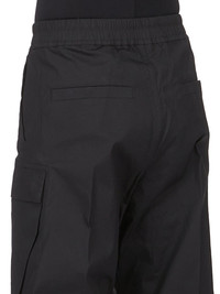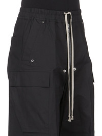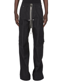 RICK OWENS FW25 CONCORDIANS CARGOBELAS IN BLACK HEAVY COTTON POPLIN THESE CARGOBELAS PANTS ARE FULL-LENGTH WITH A LOW CROTCH AND WIDE LEG. THEY FEATURE AN ELASTICIZED WAISTBAND WITH DRAWSTRING AND A BELA EXPOSED CENTER ZIPPER WITH TWO SNAP DETAIL AT BOTTOM. THEY HAVE SIDE WELT POCKETS WITH RIVET AND EYELET DETAIL, FOUR BEVELED CARGO POCKETS ON THE SIDE LEG AND TWO REAR WELT POCKETS WITH CONCEALED SNAPS AND TOPSTITCHING THIS MEDIUMWEIGHT COTTON POPLIN HAS A CRISP HANDFEEL AND WASHED FINISH THIS FABRIC IS MADE USING GOTS CERTIFIED ORGANIC COTTON WHICH MEANS THE NATURAL FIBER IS GROWN WITHOUT HARMFUL CHEMICALS, LEAVING OUR SOIL, AIR AND WATER CLEANER FROM CONTAMINATES COLOR: BLACK MATERIAL: 97% COTTON + 3% ELASTANE BUTTONS 100% BUFFALO HORN MODEL IS 189CM TALL MODEL WEARS SIZE 48