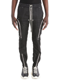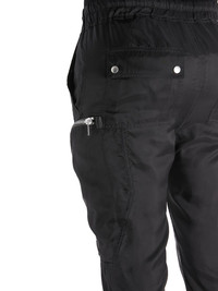 RICK OWENS SS22 FOGACHINE BAUHAUS CARGO IN CUPRO JAPONETTE THESE BAUHAUS CARGO PANTS ARE FULL-LENGTH WITH A SLIM FIT. THEY HAVE AN ELASTICIZED WAISTBAND WITH DRAWSTRING, A BELA EXPOSED ZIPPER WITH SNAP DETAIL, ROUNDED BAUHAUS ZIPPED POCKETS ON BOTH THIGHS WITH EYELETS, FRONT SHIN SPLITS WITH ZIPPERS AND ELASTICIZED CUFFS. THEY HAVE SIDE FRONT WELT POCKETS WITH EYELET AND RIVET DETAIL, SQUARE BACK POCKETS WITH FLAPS AND SNAPS, AND FRONT YOKES AND SEAMS WITH DOUBLE TOP STITCHING THIS CUPRO JAPONETTE IS LIGHTWEIGHT AND DRAPEY. WE CHOSE CUPRO FOR THIS PRODUCT BECAUSE CUPRO FIBER IS BIODEGRADABLE AND 100% PLANT BASED. AS IT’S MADE FROM COTTON WASTE, CUPRO HELPS FIND A PURPOSE TO FIBERS THAT WOULD OTHERWISE BE DISCARDED - COLOR: BLACK - MATERIAL: . 100% CUPRO - POCKETS TONGUE 100% CALF LEATHER - MODEL IS WEARING SIZE 48 - MODEL IS 189 CM TALL