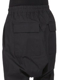 RICK OWENS SS26 TEMPLE DRAWSTRING LONG IN BLACK HEAVY POPLIN THESE DRAWSTRING LONG PANTS ARE FULL LENGTH WITH A DROPPED CROTCH. THEY HAVE AN ELASTICIZED WAISTBAND WITH DRAWSTRING, A CONCEALED FLY, AND CREASES IN THE FRONT AND BACK LEG. THEY FEATURE TWO SIDE FRONT POCKETS AND TWO SQUARE BACK POCKETS WITH FLAPS AND TOPSTITCHING THIS MEDIUMWEIGHT COTTON POPLIN HAS A CRISP HANDFEEL AND WASHED FINISH THIS FABRIC IS MADE USING GOTS CERTIFIED ORGANIC COTTON WHICH MEANS THE NATURAL FIBRE IS GROWN WITHOUT HARMFUL CHEMICALS, LEAVING OUR SOIL, AIR AND WATER CLEANER FROM CONTAMINATES COLOR: BLACK MATERIAL: 97% COTTON + 3% ELASTANE BUTTONS 100% BUFFALO HORN MODEL IS 189CM TALL MODEL WEARS SIZE 48