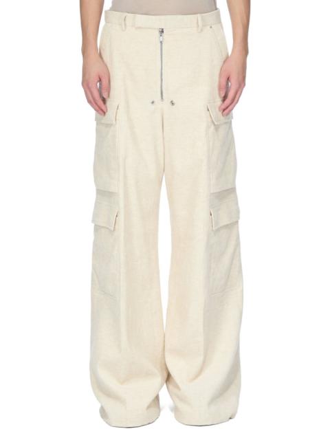 RICK OWENS FW25 CONCORDIANS WIDE BELA PANTS IN BLACK HEAVY COTTON POPLIN THESE WIDE BELA PANTS ARE FULL-LENGTH WITH A LOW CROTCH AND WIDE LEG. THEY FEATURE AN ELASTICIZED WAISTBAND WITH DRAWSTRING AND A BELA EXPOSED CENTER ZIPPER WITH TWO SNAP DETAIL AT BOTTOM. THEY HAVE SIDE WELT POCKETS WITH RIVET AND EYELET DETAIL AND BACK POCKETS WITH FLAPS AND SNAP CLOSURES THIS MEDIUMWEIGHT COTTON POPLIN HAS A CRISP HANDFEEL AND WASHED FINISH THIS FABRIC IS MADE USING GOTS CERTIFIED ORGANIC COTTON WHICH MEANS THE NATURAL FIBER IS GROWN WITHOUT HARMFUL CHEMICALS, LEAVING OUR SOIL, AIR AND WATER CLEANER FROM CONTAMINATES COLOR: BLACK MATERIAL: 97% COTTON + 3% ELASTANE MODEL IS 189CM TALL MODEL WEARS SIZE 48