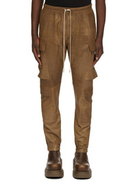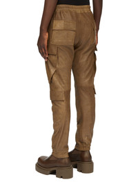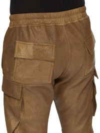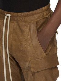RICK OWENS FW24 PORTERVILLE MASTODON MEGACARGO IN BEAN BLISTER LAMB LEATHER THESE MASTODON MEGACARGO PANTS ARE FULL LENGTH WITH A SLIM FIT AND AN ELASTICIZED WAISTBAND WITH DRAWSTRING AND ELASTICATED ANKLES. THEY FEATURE TWO SQUARE CARGO POCKETS ON THE THIGH, WITH TWO BEVELED CARGO POCKETS BELOW, AND TWO SQUARE BACK POCKETS, ALL HAVE FLAPS WITH HOOK AND LOOP FASTENINGS AND TOPSTITCHING THIS LIGHTWEIGHT LAMB LEATHER HAS AN EXAGGERATED UNEVEN BLISTERED TEXTURE AND A SOFT, FLUID HANDFEEL. THE BLISTERED TEXTURE IS ACHIEVED BY EXAGGERATION THE NATURAL GRAIN TEXTURE OF EACH SKIN, THEREFORE THE LOOK OF EACH SKIN IS UNIQUE. - COLOR: BEAN - MATERIAL: 100% LAMB LEATHER - LINING 100% CUPRO - BUTTONS 100% BUFFALO HORN - MODEL IS 189CM TALL - MODEL WEARS SIZE 48