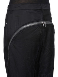 RICK OWENS SS26 TEMPLE BOLAN BANANA IN BLACK CUPRO SATIN THIS BOLAN BANANA IS A HIGH WAISTED, SLIM FIT, 5 POCKET JEAN WITH A FLOOR-LENGTH BOOT CUT. THEY HAVE A CONCEALED BUTTON FLY AND A WAISTBAND WITH CENTER BUTTON, BELT LOOPS AND POCKET RIVETS AND BACK PATCH POCKETS WITH TOPSTITCHING. THEY FEATURE A LONG ZIPPER RUNNING FROM CENTER BUTT, CURVING AROUND THE HIP TO THE HEM. IT CAN UNZIP AT BACK TO EXPOSE THE BUTT, AND ALSO ZIP UP FROM THE HEM TO EXPOSE AN INNER FLARED PANEL IN THE LEG. THIS LIGHTWEIGHT AND FLUID CUPRO SATIN HAS A GLOSSY SURFACE, A SOFT HANDFEEL AND WASHED FINISH. THIS FABRIC IS MADE USING CUPRO WHICH IS BIODEGRADABLE AND 100% PLANT BASED. AS IT’S MADE FROM COTTON WASTE, CUPRO HELPS FIND A PURPOSE TO FIBERS THAT WOULD OTHERWISE BE DISCARDED. COLOR: BLACK MATERIAL:100% CUPRO MODEL IS 189CM TALL MODEL WEARS SIZE 31